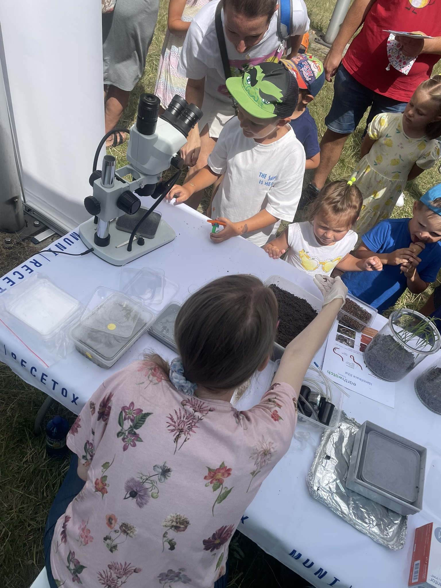 “In the biological section, visitors could explore soil texture and observe soil invertebrates – springtails and nematodes – under the microscope. In the chemical section, they had the chance to create a chromatogram and learn how we analyze pesticides in tomatoes or cucumbers. Sand painting is also one of the most popular activities at our booth,” explained Anna Ireinová, lab technician from the RECETOX Mechanistic Environmental Toxicology unit.